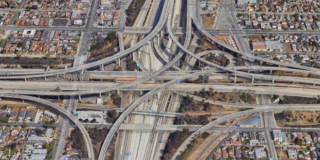 A Los Angeles ci si muove soprattutto in macchina, grazie all’Interstate Highway Sistems, un tentacolare sistema di autostrade a 8/10 corsie, connesse fra loro da quell’intreccio spettacolare di raccordi a quadrifoglio che abbiamo visto in decine di film americani; il traffico è naturalmente folle a qualunque ora del giorno e della notte (Los Angeles ha il triste primato della città più trafficata degli Stati Uniti), malgrado le corsie riservate al carpooling, dove possono viaggiare solo vetture con almeno tre passeggeri a bordo. 52.000 ettari cittadini (pari circa a 74.000 campi di calcio) sono destinati a parcheggi.